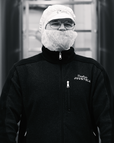 ”Tasaisen korkea laatu”, tokaisee laatupäällikkö Arttu Karjalainen kun kysyy mikä ominaisuus on tunnusomaista Vaalan valmistamille tuotteille. Syntyperäinen vaalalainen Arttu tuli taloon 10 vuotta sitten, työn ohella Arttu on kouluttautunut mm. Tuotekehitystyön ammattitutkinnolla. Arttu vastaa juustolan laatupuolesta ja tarvittavista dokumentoinneista. Laatupäällikkönä Arttu työskentelee tarvittaessa myös tuotannon ja pakkaamon puolella. Hektisen työn vastapainoksi kolmen lapsen liikkuva perheenisä nauttii Vaalan tarjoamista liikunta ja luontopalveluista.
